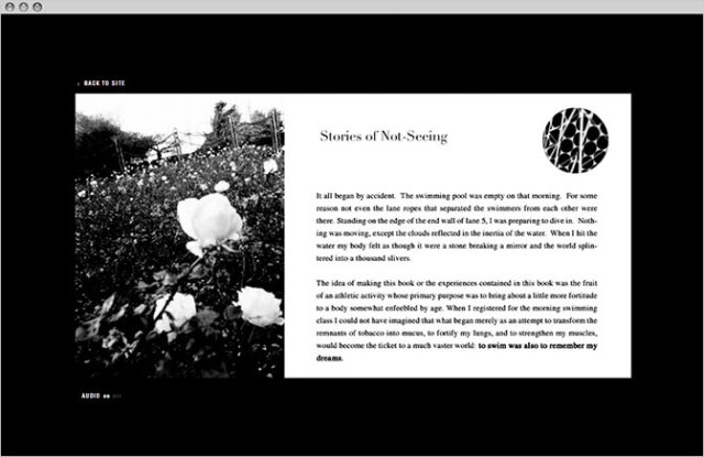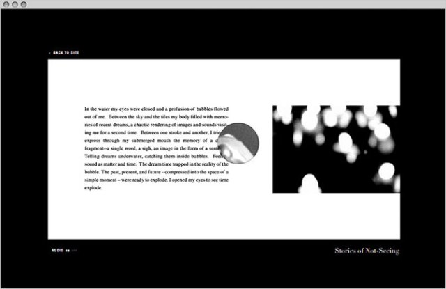 This micro-site is a especial section for Cao Guimarães website, created to promote the artist’s book Stories of Not-Seeing. The navigation is done with a mouse-following mask that reveals, in inverted colors, the subsequent page’s content.