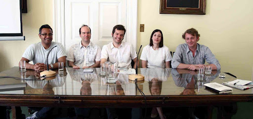 | Swarming Futures symposium: (left to right) Abraham Thomas (V&A), Carlos Teixeira (Vazio S/A), Ricardo de Ostos (NaJa & deOstos), Ellie Stathaki (Wallpaper), Gui Sibaud (Tryptique) – Photo: Anna Stathaki |